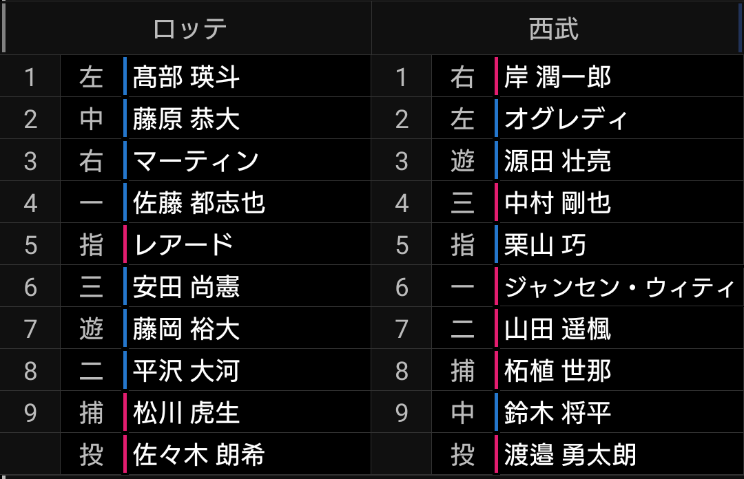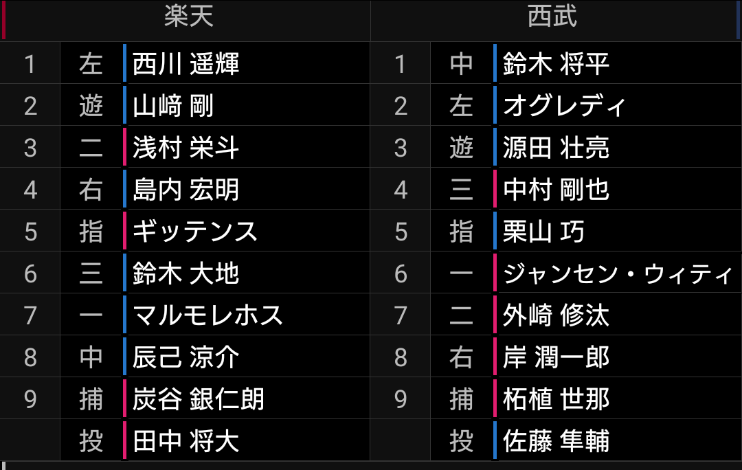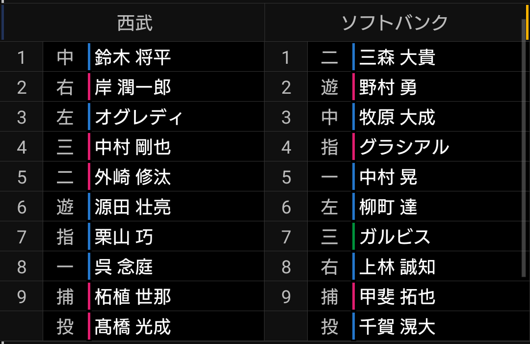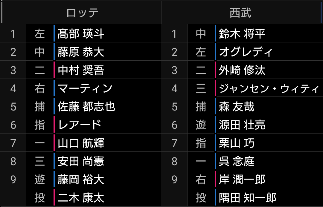 個人的には1番鈴木、2番岸、3番オグレディ、4番呉の打線でもと思いましたが、チームは6連敗と苦しい状況ですし起用された以上、中村選手のチームを救う打撃を期待したいです。
