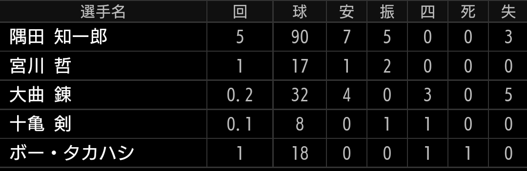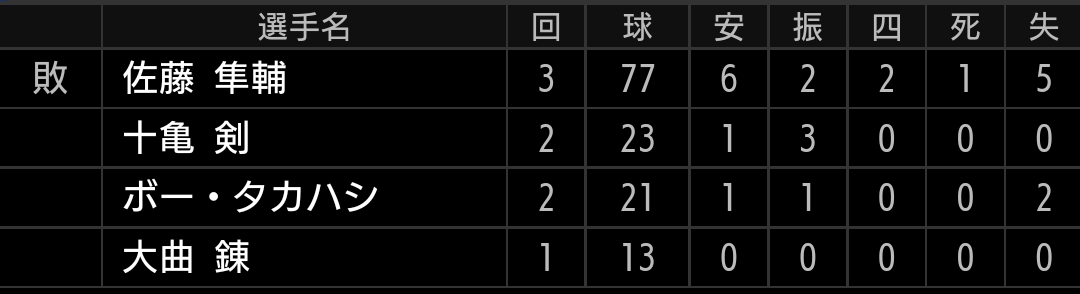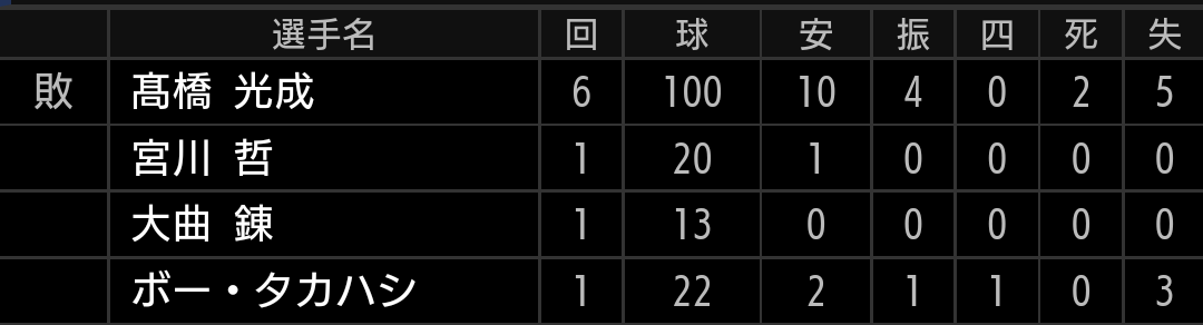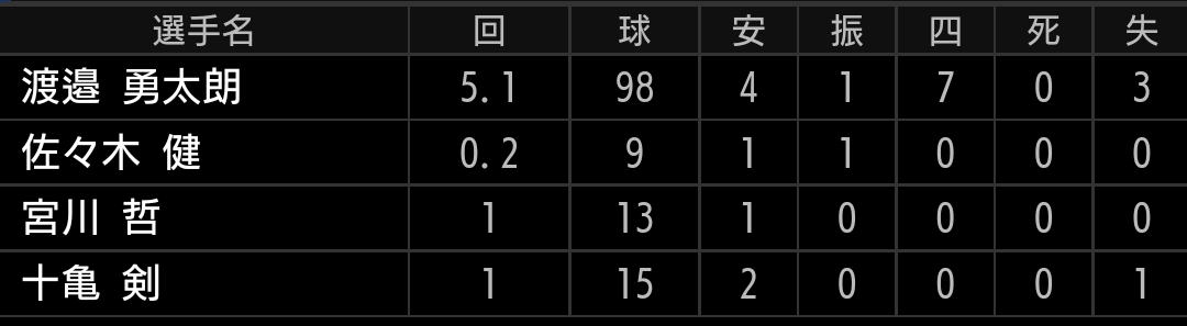 ボー投手は、年齢的にも伸びしろのある投手だと信じたいので、中継ぎをやるなら、ストレートで空振りは取れなくてもコースに制球出来るようにすること、そして、空振りを狙える変化球を一つ身につけてもらいたいです。