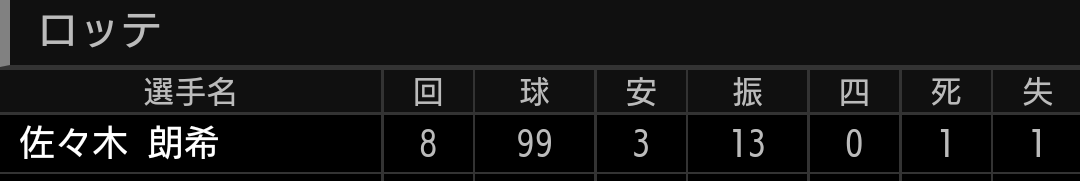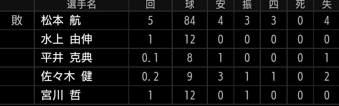 牧原選手にホームランを打たれるなど、3失点です。中継ぎとして獲得しましたが、球は速いですが空振りが取れず、決め球も不足しているため、中継ぎとしての使い所が難しいです。