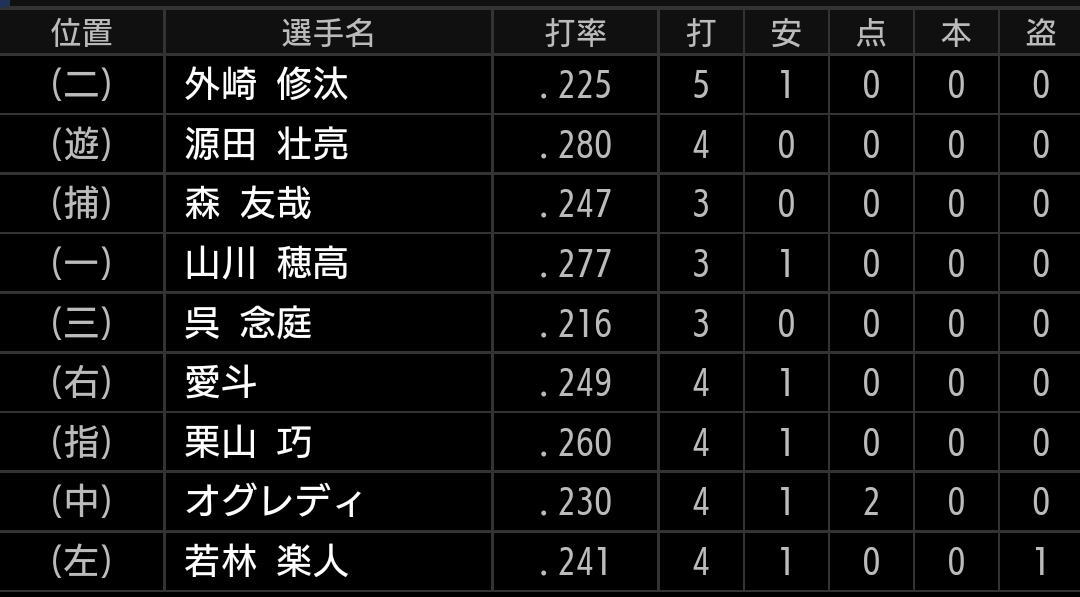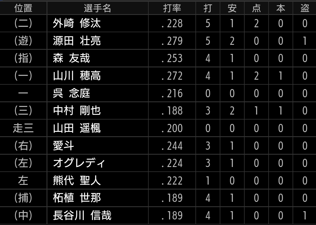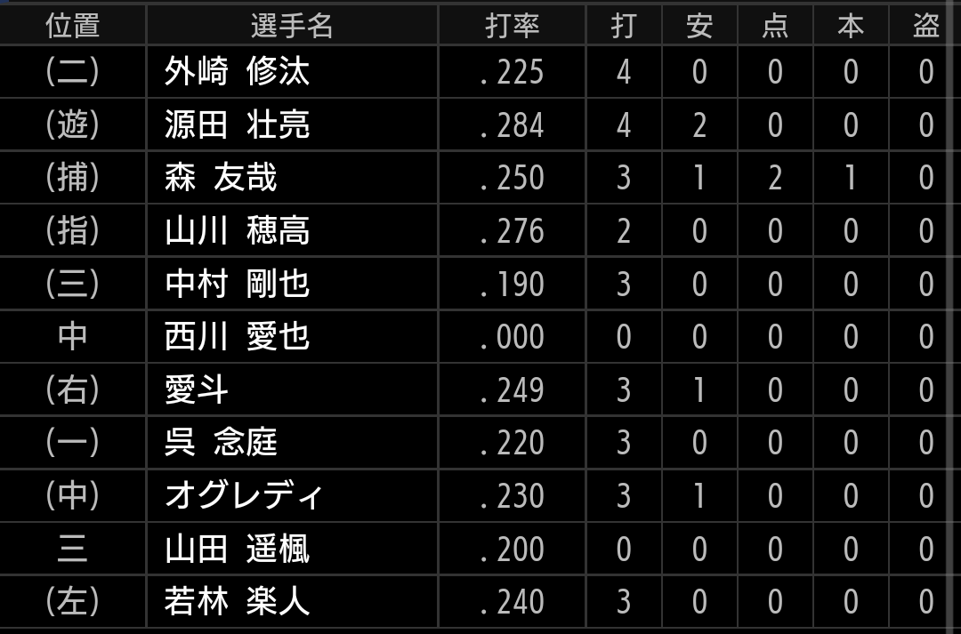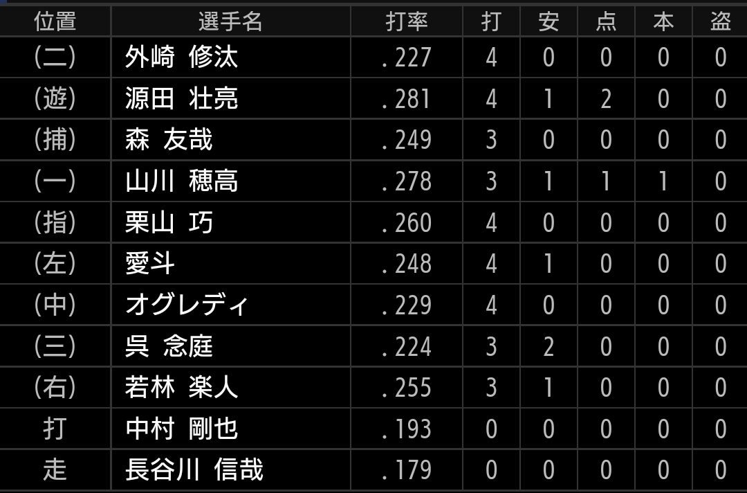 特に、5回裏の源田選手から始まる2巡目で捕らえたかったですが、今日はコア4が機能しませんでした。