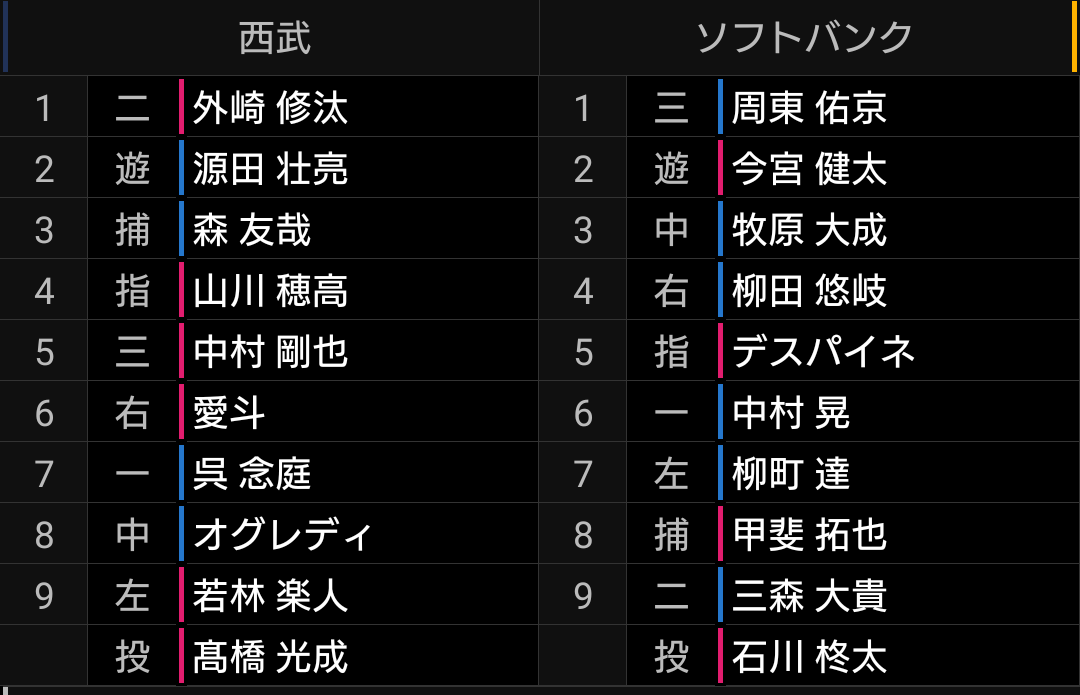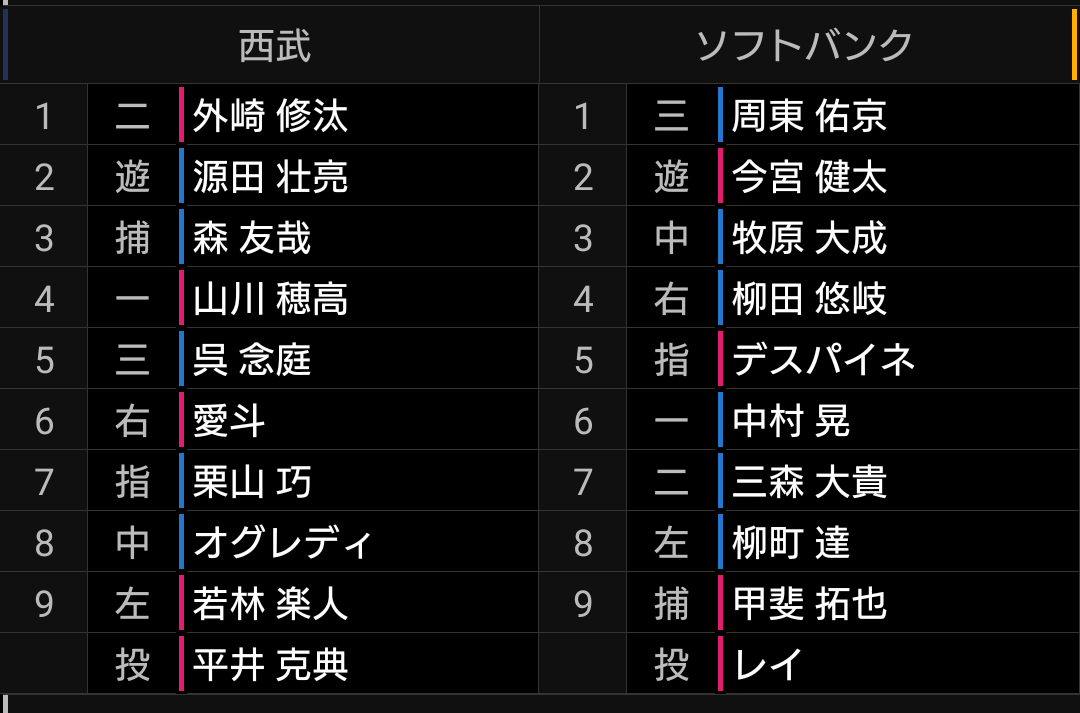 ソフトバンク先発のレイ投手は、制球が乱れていましたし甘い球も多く、打てなくはない投球でしたが、ライオンズ打線の状態の方が悪かったです。