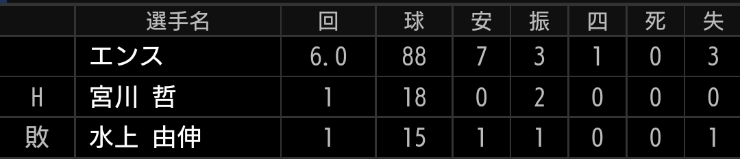 4回途中5失点でKOです。立ち上がりから変化球が高く、甘く入った所を連打され初回で3失点です。さらに4回には、モーションを盗まれ2盗3盗と決められ、スクイズに対しては捕球ミスで失点と自滅です。