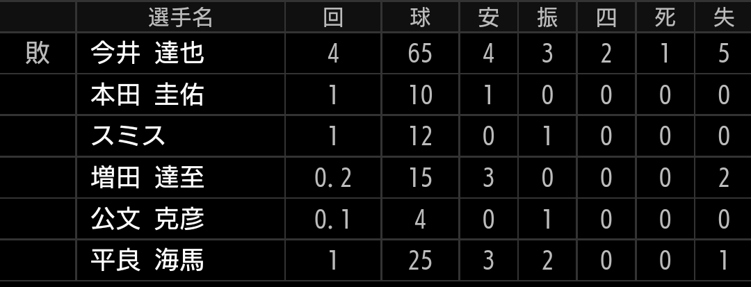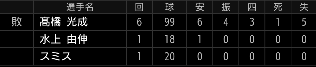 制球が甘く、球に力もなく2失点でKOです。ストレートゴリ押しでは抑えられなくなり、スライダーをメインに投球をしていますが、制球が甘かったです。