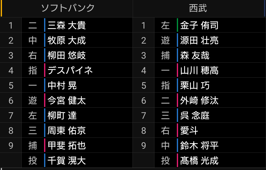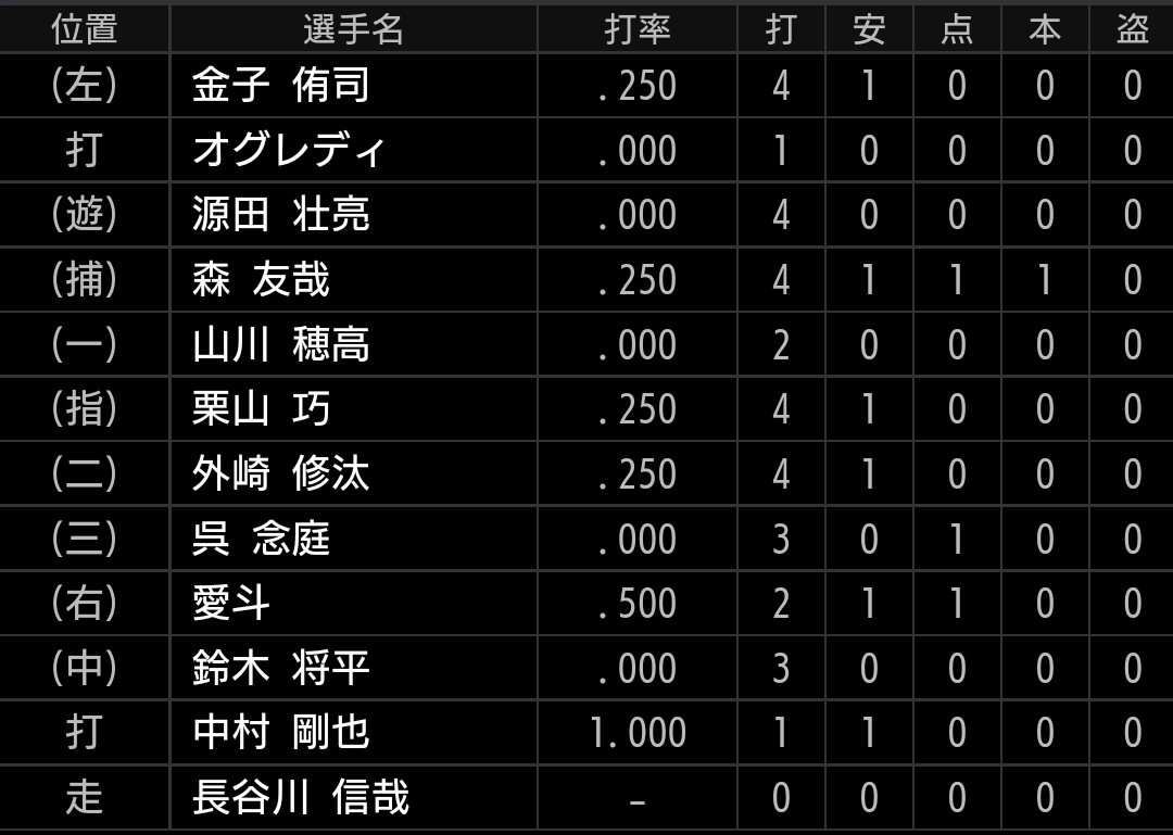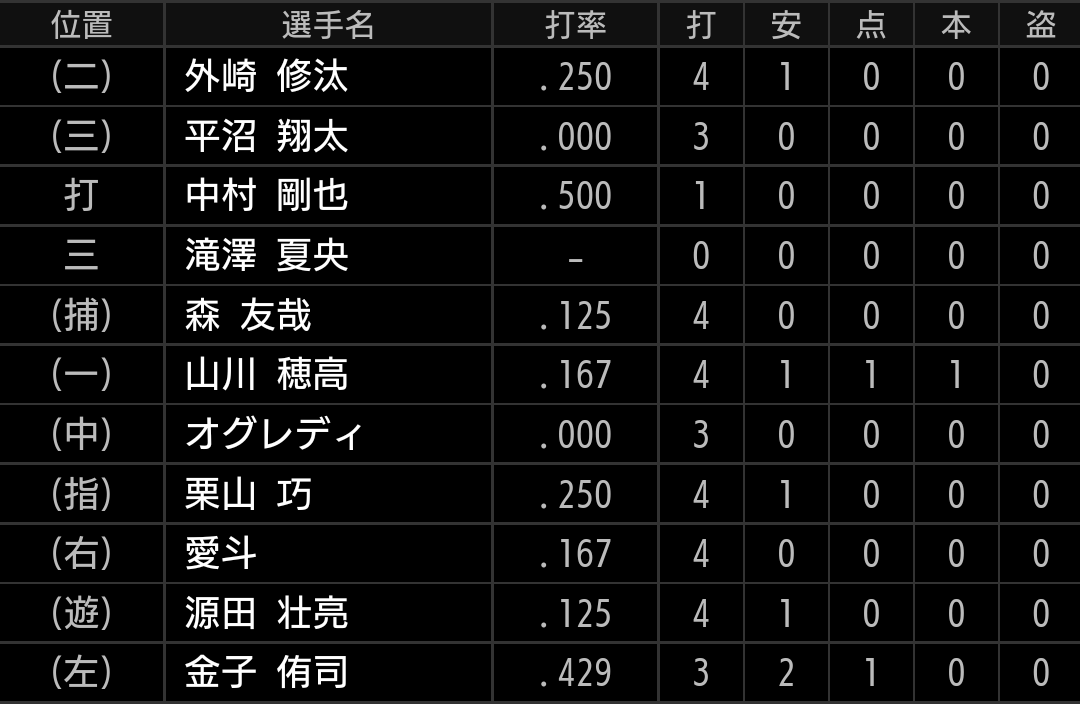 昨日3三振の源田選手を下位に、サードは2三振の呉選手に代えて平沼選手を入れました。また、東浜投手から.500(10-5)と相性の良い、オグレディ選手を5番に起用です。