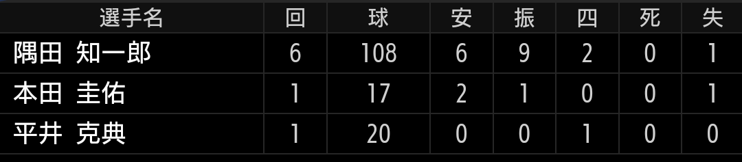 相性の良い日ハム相手でしたが、2盗、3盗と決められバントで失点したり、自らのフィルダースチョイスで失点したりと勿体ない失点でした。焦る必要はない場面でしたが、今日は守備のミスで自らの足を引っ張りました。