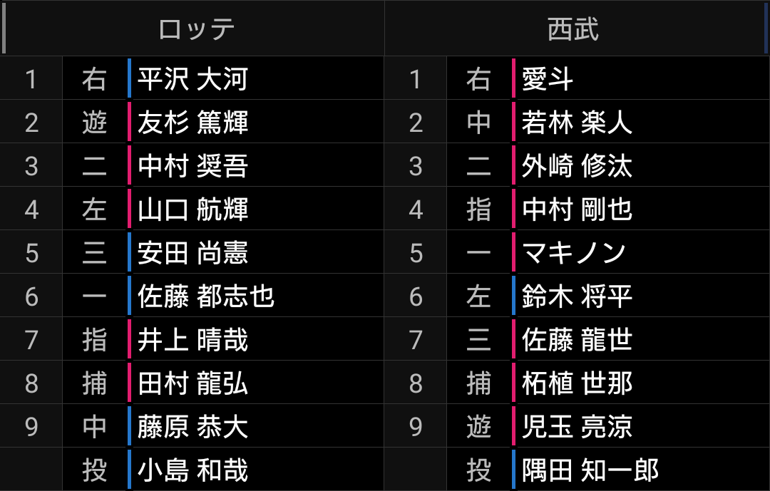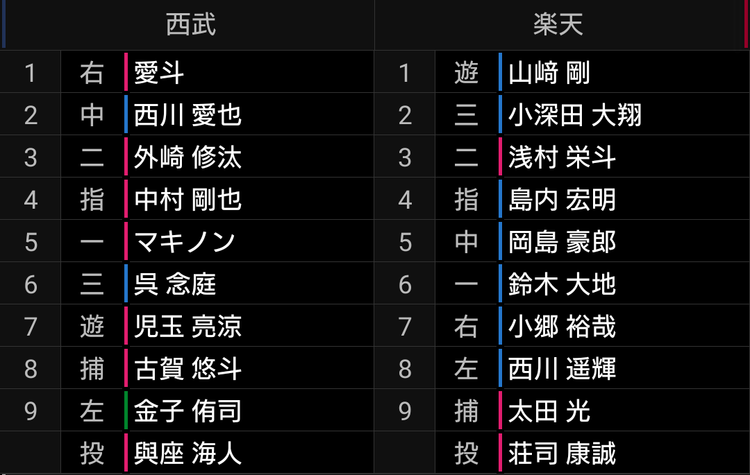中村選手が好調なので、普通に考えれば4番は中村選手です。ただ、松井監督は山川選手のプライドに配慮して4番にするかと思いましたが、今の調子を優先して山川選手6番スタメンは良い判断だと思います。