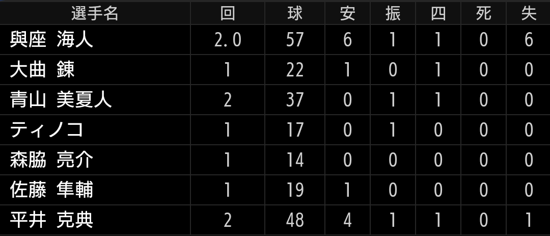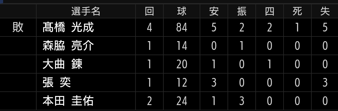 ストレートは弾き返され、変化球は決まらずでは苦しいです。不安定な中継ぎ陣の中では比較的良い投球をしていましたが、前回から怪しくなり、今日は下位打線相手でも打たれました。