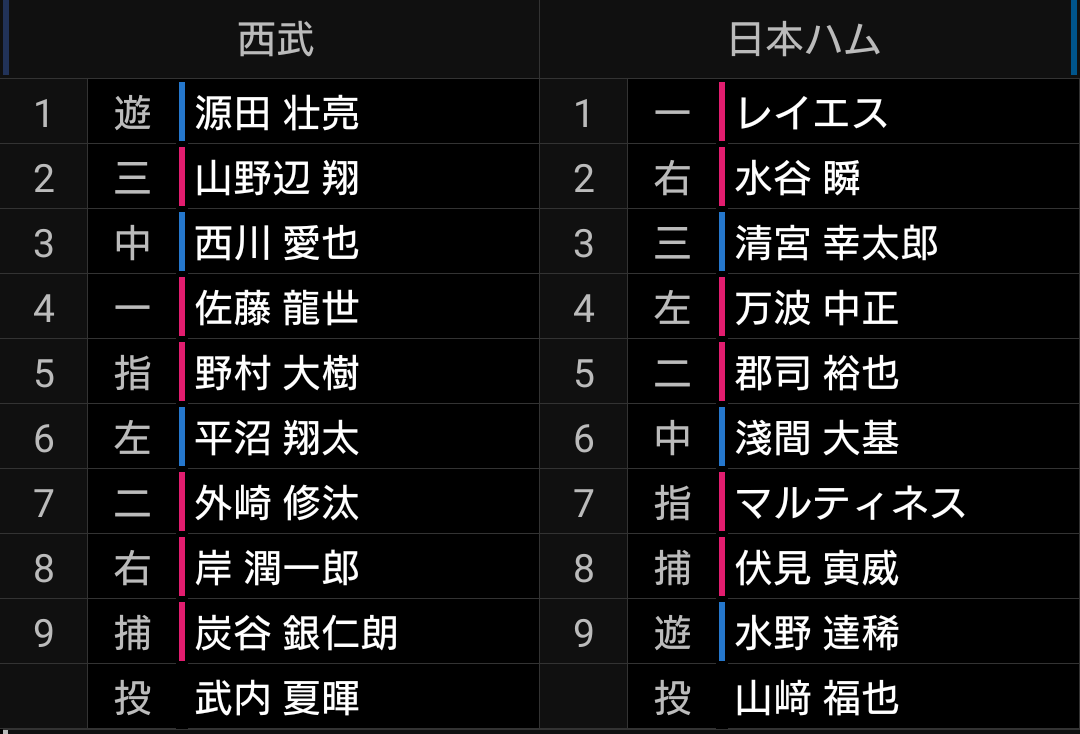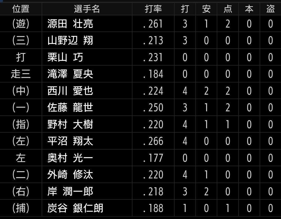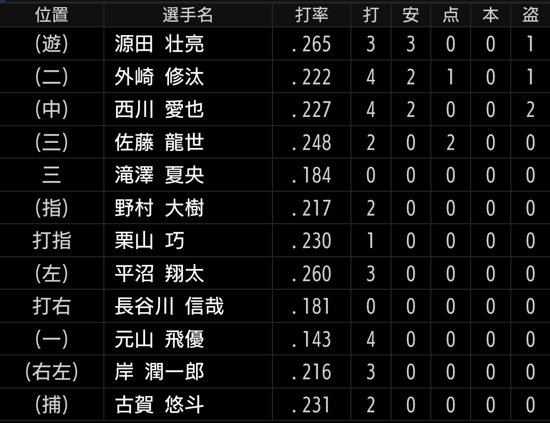 西川選手にはフォークを連投し、比較的浮いていましたので捕らえて欲しかったですが残念です。