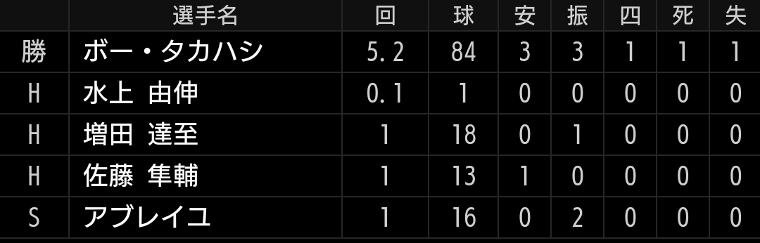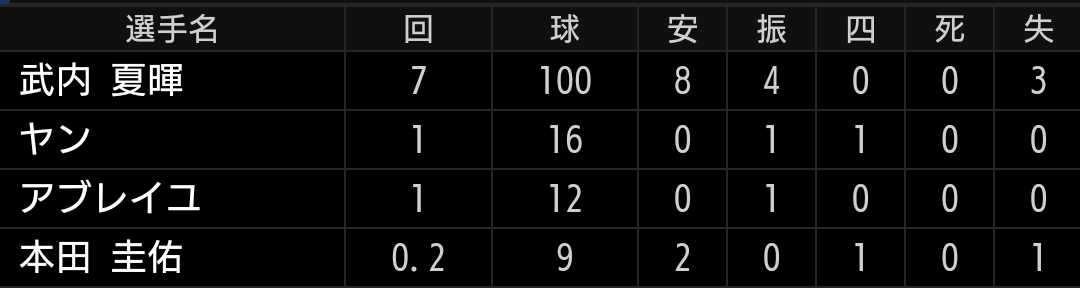 甲斐野投手が離脱したため、セットアッパー起用となりました。前回同様に変化球がイマイチでしたが、ストレートの球威で打ち取っています。