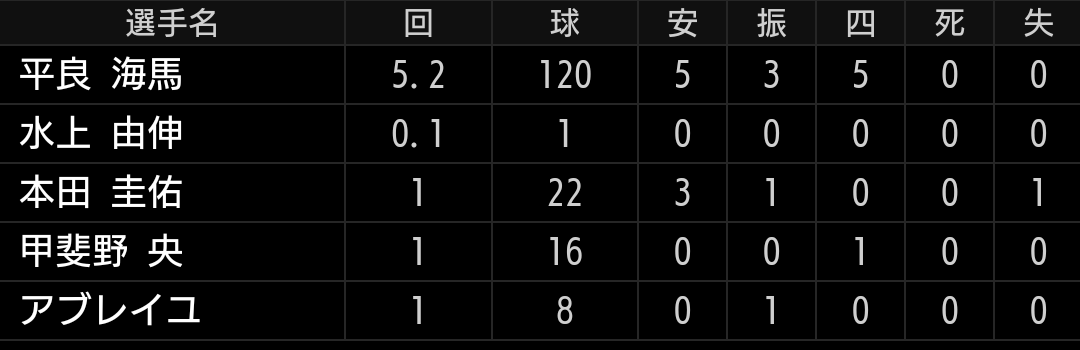 ランナーを出しましたが、併殺で切り抜けました。この展開でも今日は甲斐野、アブレイユ投手を使いたくない試合でしたので、そういう場合は昨年までなら森脇投手が登板していましたが、森脇投手がいない今、本田投手がその役割が出来るのはチームとしても助かります。