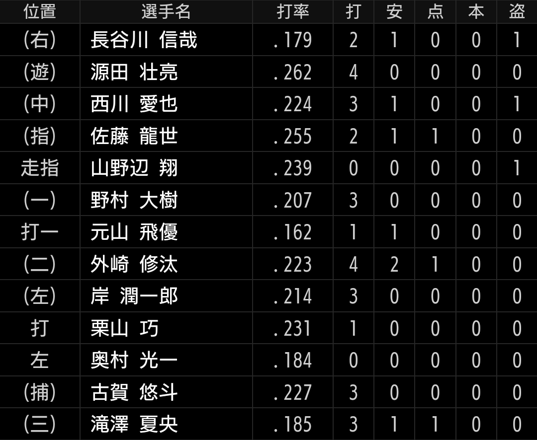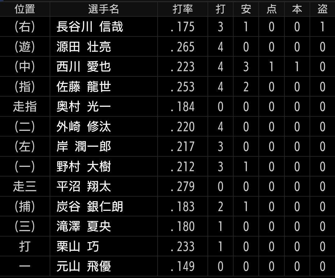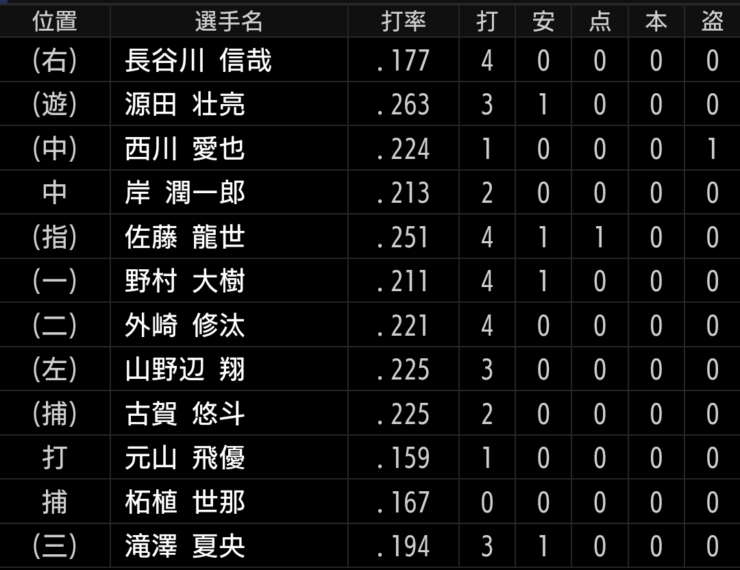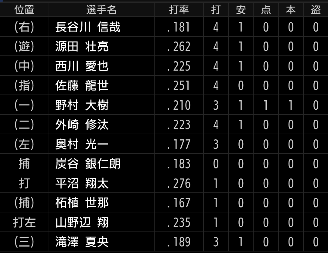 初回は不安定な佐々木朗希投手から得点しましたが、大差も付けられた事もあり、その後は楽に投げさせてしまいました。
