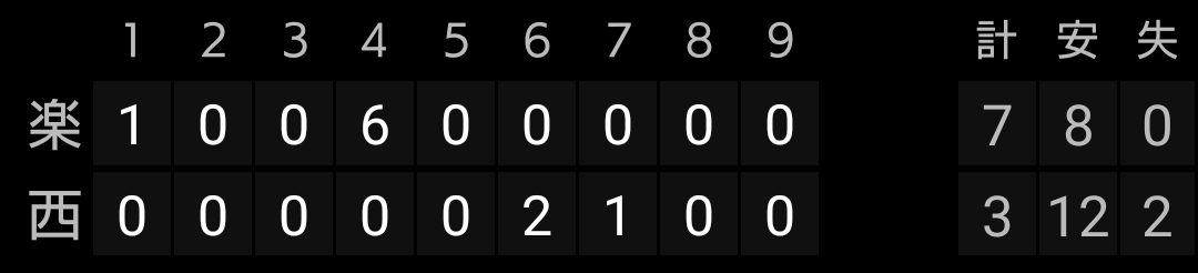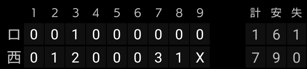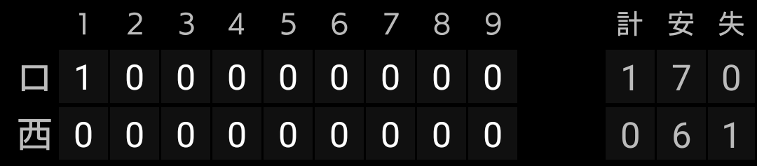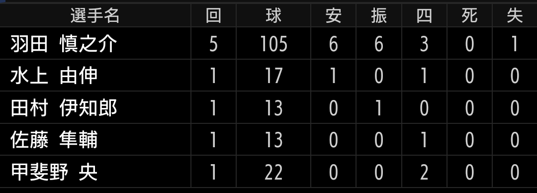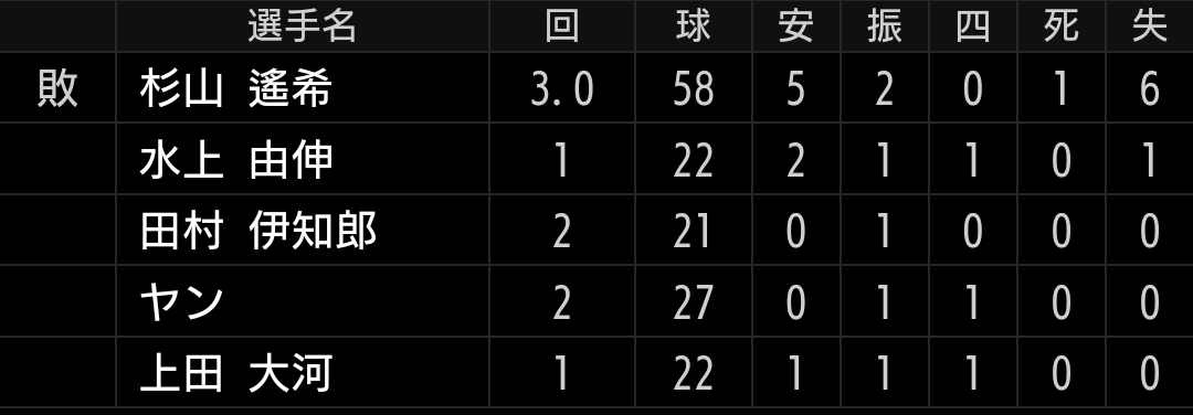 金子侑司選手は、ニゴロ、空三振、中飛、投ゴロ、遊直でした。