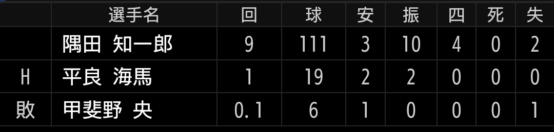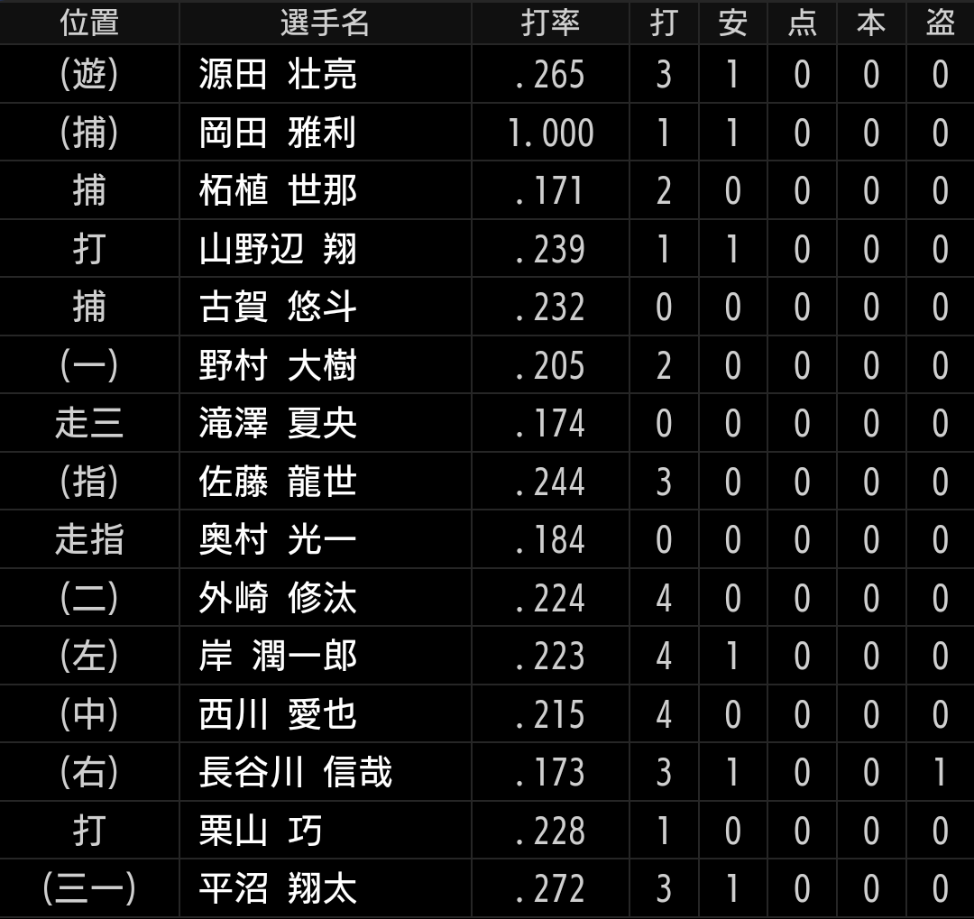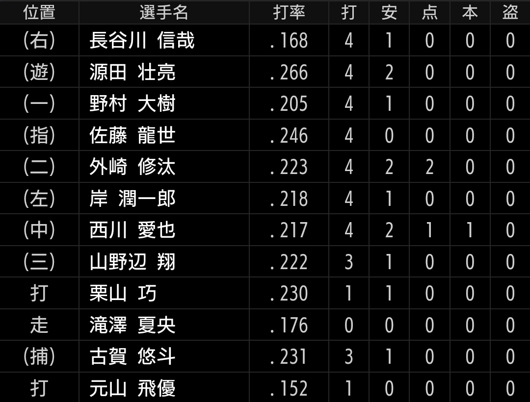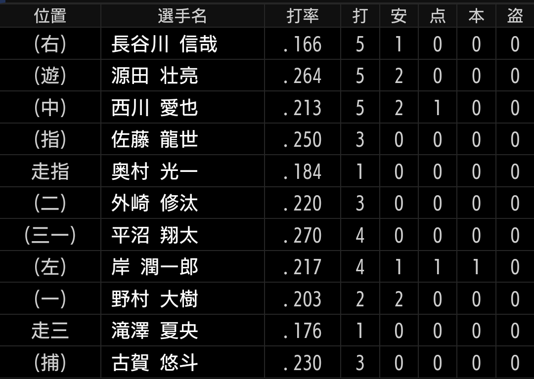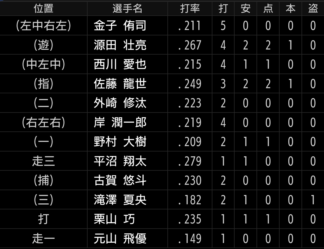山賊打線後、1番金子、2番源田がハマる未来は見られませんでしたが、この引退試合で素晴らしい活躍を見せてくれました。