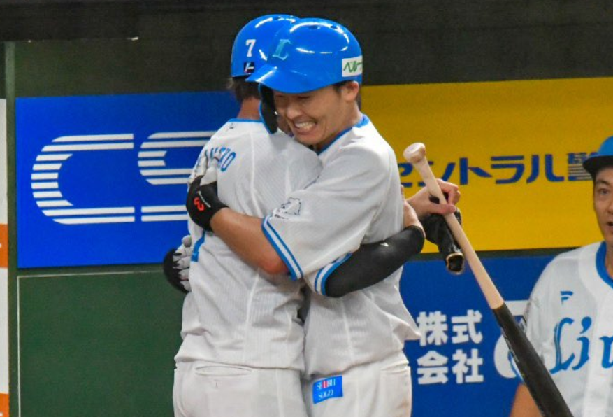 #源田壮亮 選手のホームランで #金子侑司 選手が生還!#ねこげん コンビの熱い抱擁です!#seibulions #西武ブルー #ありがとうねこさん pic.twitter.com/DhOyUa6l0z