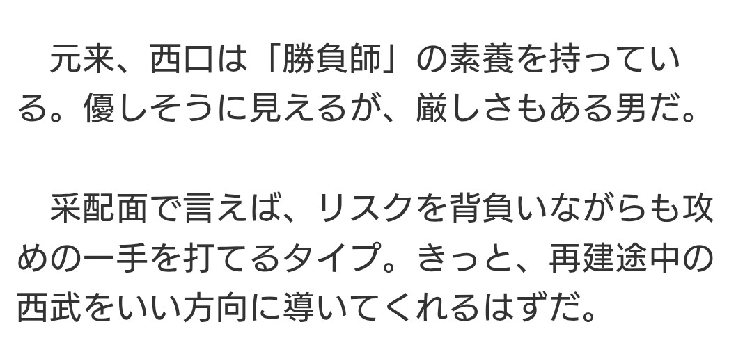 逆に、結果を出さなければ責任問題にも発展しますので、西口監督も危機感を持って来季を迎えたいです。