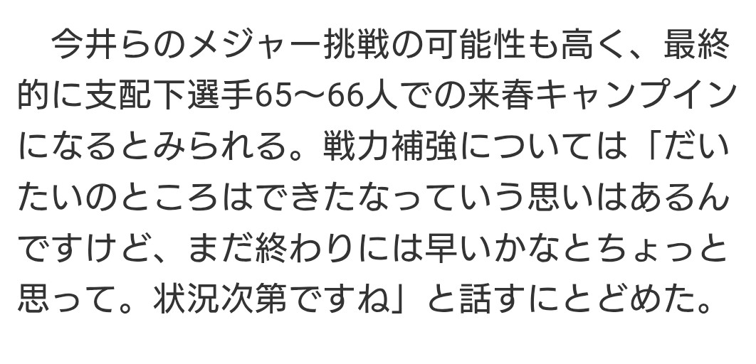 来季は支配下助っ人が7名もおり、そこに割って入るのは現実的には厳しいので、普通にやっていては無理です。