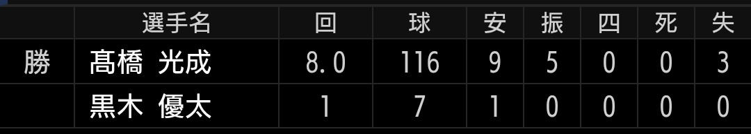ヒットこそ打たれますが、無駄な四球は出さず失点もしない試合を落ち着かせる投球を見せました。イニングも投げてくれましたし助かりましたが、黒木投手同様にちょっと使い過ぎです。