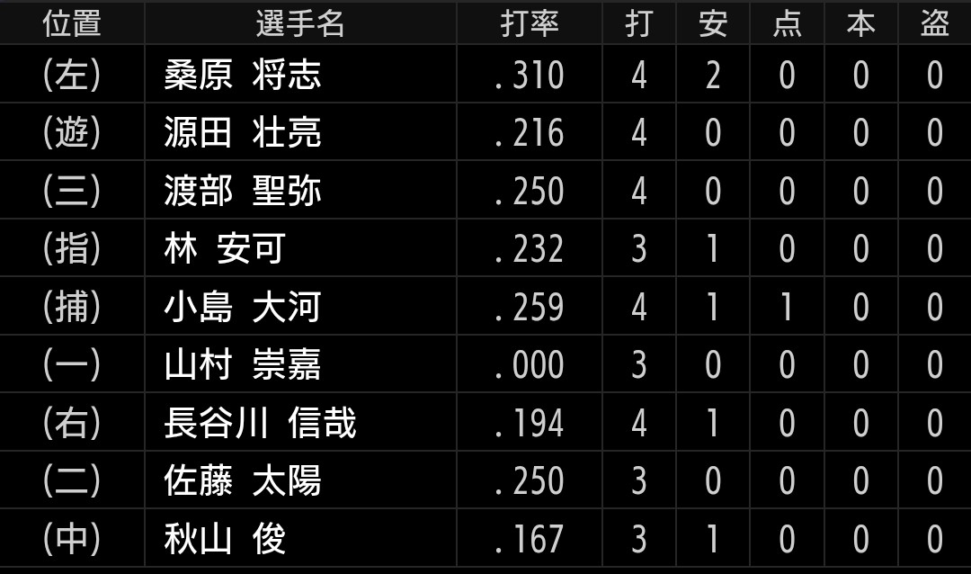 今日もミスで無得点の雰囲気でしたが、桑原選手がよく打ちました。